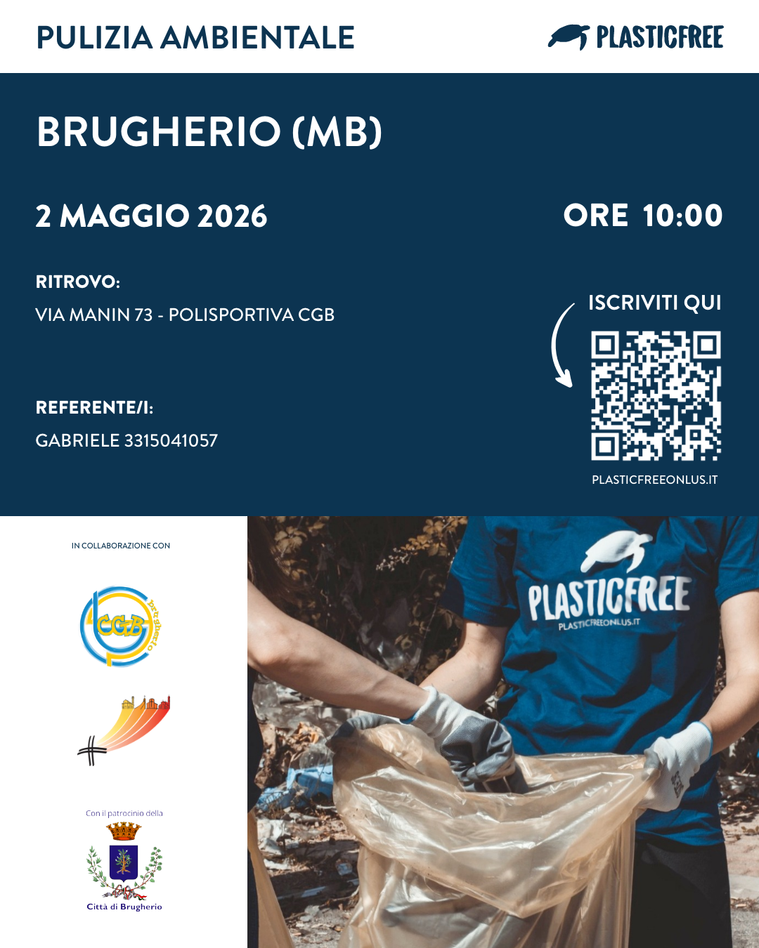 Il Comune di Brugherio aderisce con patrocinio all'iniziativa di pulizia ambientale promossa da Plastic Free Onlus, l'organizzazione di volontariato attiva dal 2019 nella lotta all'inquinamento da plastica e rifiuti abbandonati, che conta oggi oltre 260.000 volontari e ha rimosso dall'ambiente più di 4,8 milioni di chilogrammi di rifiuti su tutto il territorio nazionale.