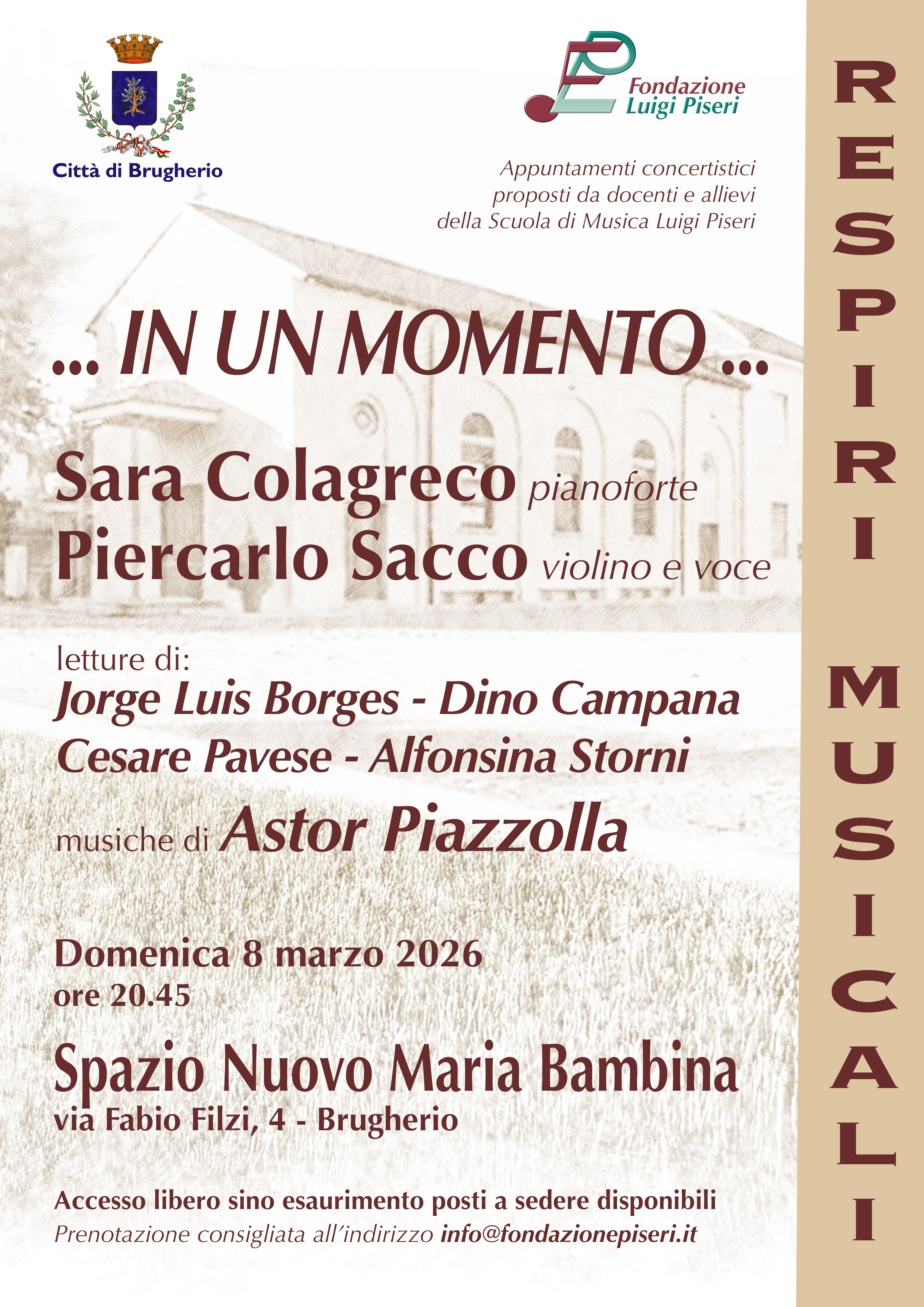 Protagonisti Piercarlo Sacco, al violino e voce, e Sara Colagreco al pianoforte. Il programma alterna celebri e meno noti brani di Astor Piazzolla a intense letture poetiche e letterarie: pagine di Jorge Luis Borges (La luna, El Duende, La pioggia, Limites), Cesare Pavese (I pensieri di Dina, Passerò per piazza di Spagna), Alfonsina Storni (Voy a dormir) e Dino Campana (…In un momento…, testo che dà il titolo al concerto).