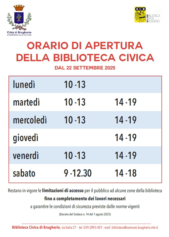 Con decreto n. 14 del 1 agosto 2025, il Sindaco ha disposto la chiusura di alcuni spazi della biblioteca.
