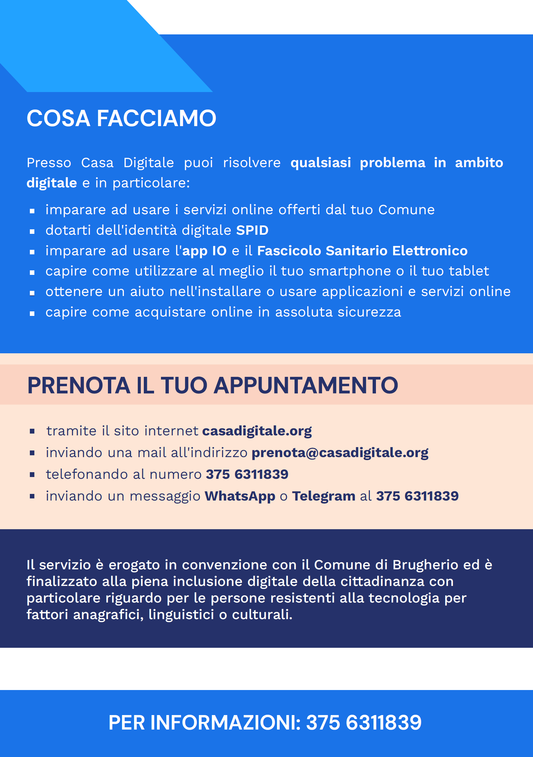 Le prenotazioni si ricevono telefonando al 375.63.11.839, numero accessibile anche via WhatsApp o Telegram o inviando una mail a: prenota@casadigitale.org