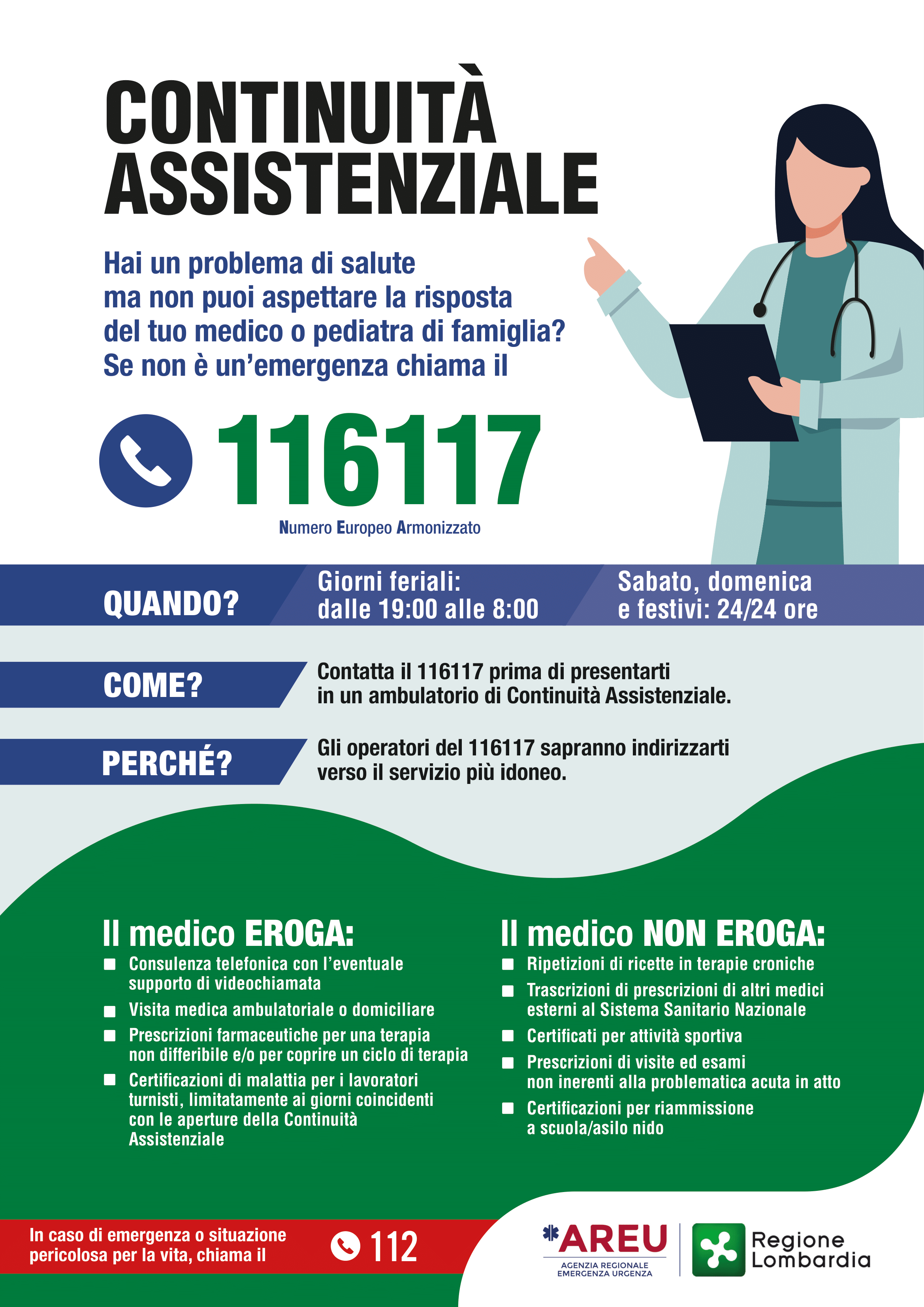 Il NEA 116117 è gratuito e attivo in Lombardia dal lunedì al venerdì dalle 19:00 alle 08:00, sabato, domenica e festivi H24.