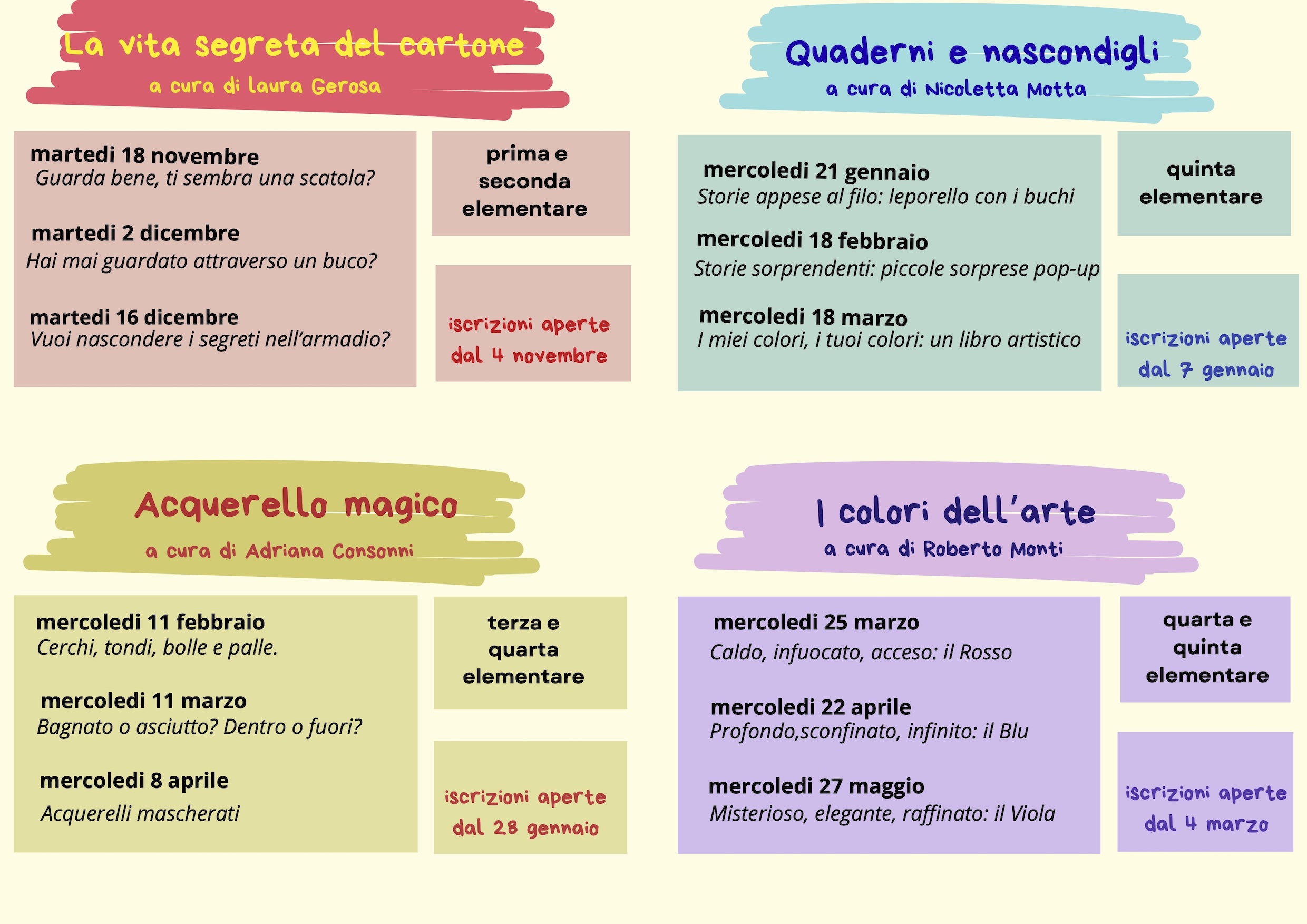 I laboratori sono pensati per stimolare la creatività dei più piccoli, attraverso attività artistiche, letture animate, giochi educativi e tanto altro. Ogni incontro è un'opportunità per imparare divertendosi, scoprire nuovi mondi attraverso la lettura e mettersi alla prova con le proprie mani!