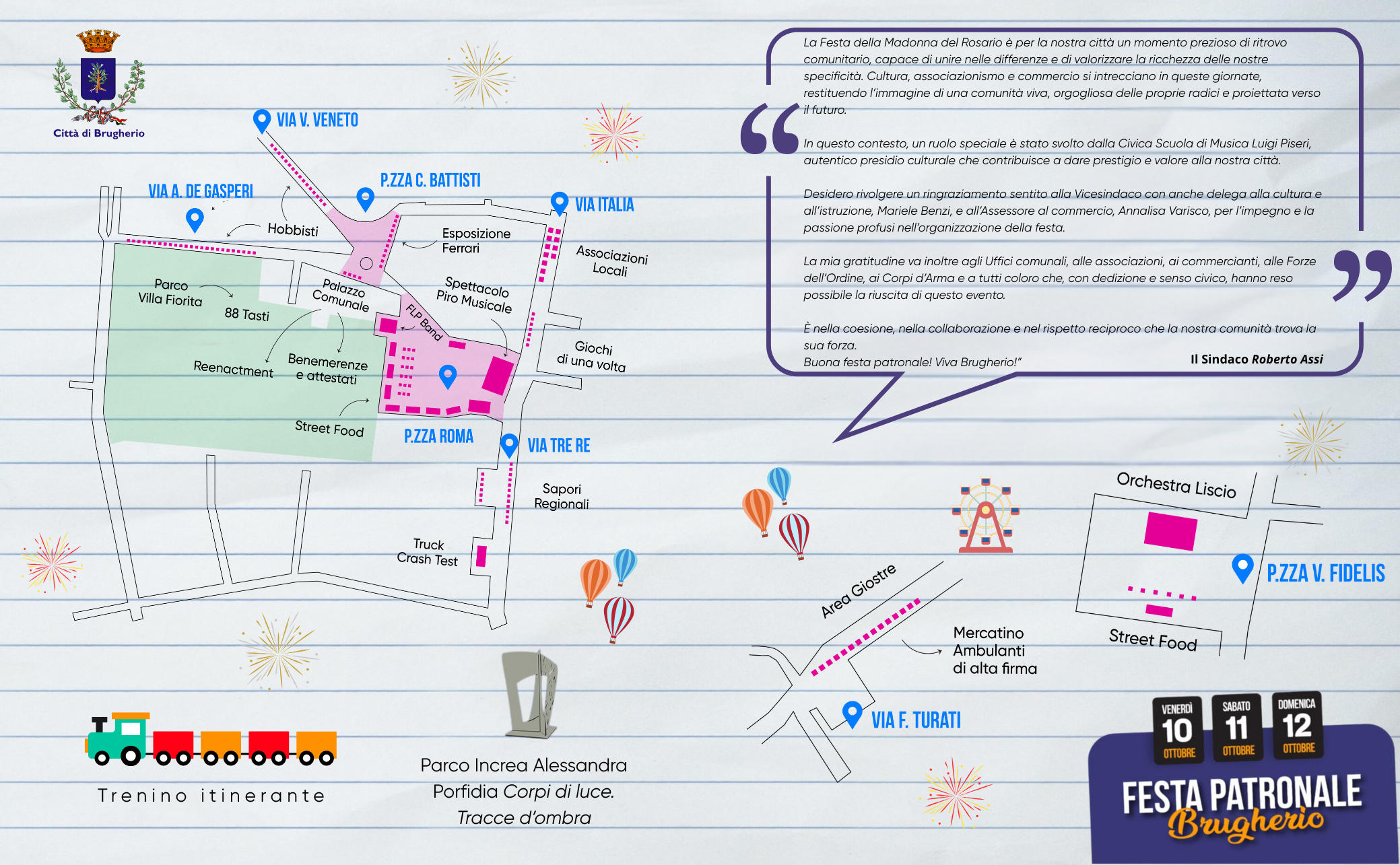 La mia gratitudine va inoltre agli Uffici comunali, alle associazioni, ai commercianti, alle Forze dell'Ordine, ai Corpi d'Arma e a tutti coloro che, con dedizione e senso civico, hanno reso possibile la riuscita di questo evento.